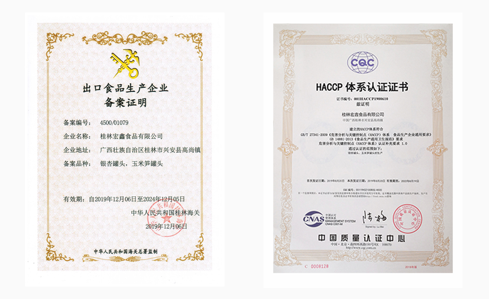 桂林宏鑫食品有限公司通過(guò)出口食品生產(chǎn)企業(yè)備案,獲得HACCP體系認(rèn)證,具備進(jìn)口貿(mào)易資質(zhì)。銀杏罐頭大量出口至日本、中國(guó)臺(tái)灣、香港、新加坡、泰國(guó)、澳洲等,是全球規(guī)模大的銀杏罐頭加工廠(chǎng)。